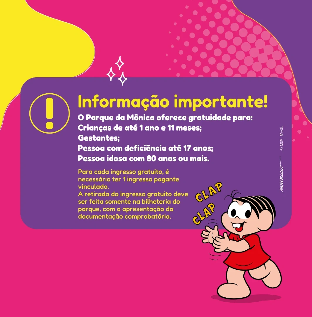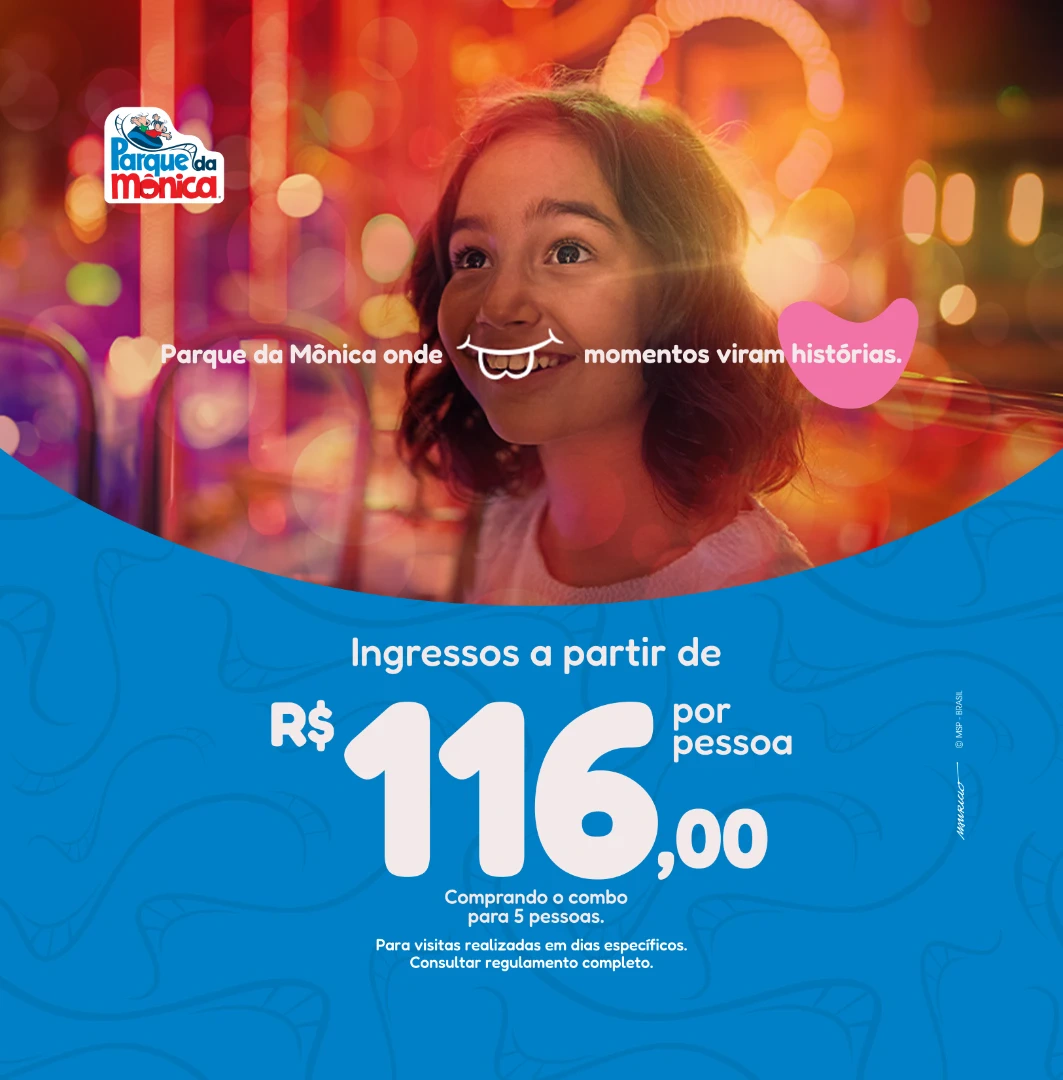 Viver um dia inesquecível no Parque da Mônica é garantir diversão para toda a família! São mais de 20 atrações para todas as idades, além de experiências especiais com a Turma da Mônica, muita música, encontros com personagens e momentos que viram memória. As datas com valores promocionais podem ser consultadas aqui As restrições de altura das atrações podem ser consultadas aqui! A programação do dia pode ser conferida aqui!